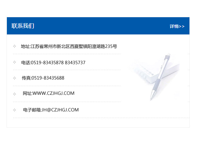 地址:常州市新北區友邦商務大廈1幢16、17層  電話:0519-85101652  傳真:0519-85112595  郵編:213022  網址:www_cz-jiayue_cn.fjyjyl.com  郵箱:xiajifengaa@163.com